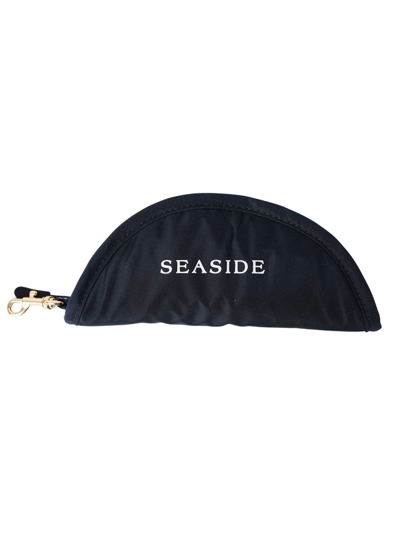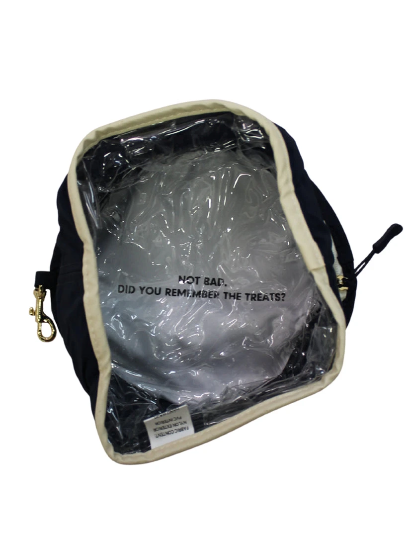 Travel navy Seaside dog water bowl. Waterproof lining. Easy to carry with clip to attach to leash, keychain, or bag.