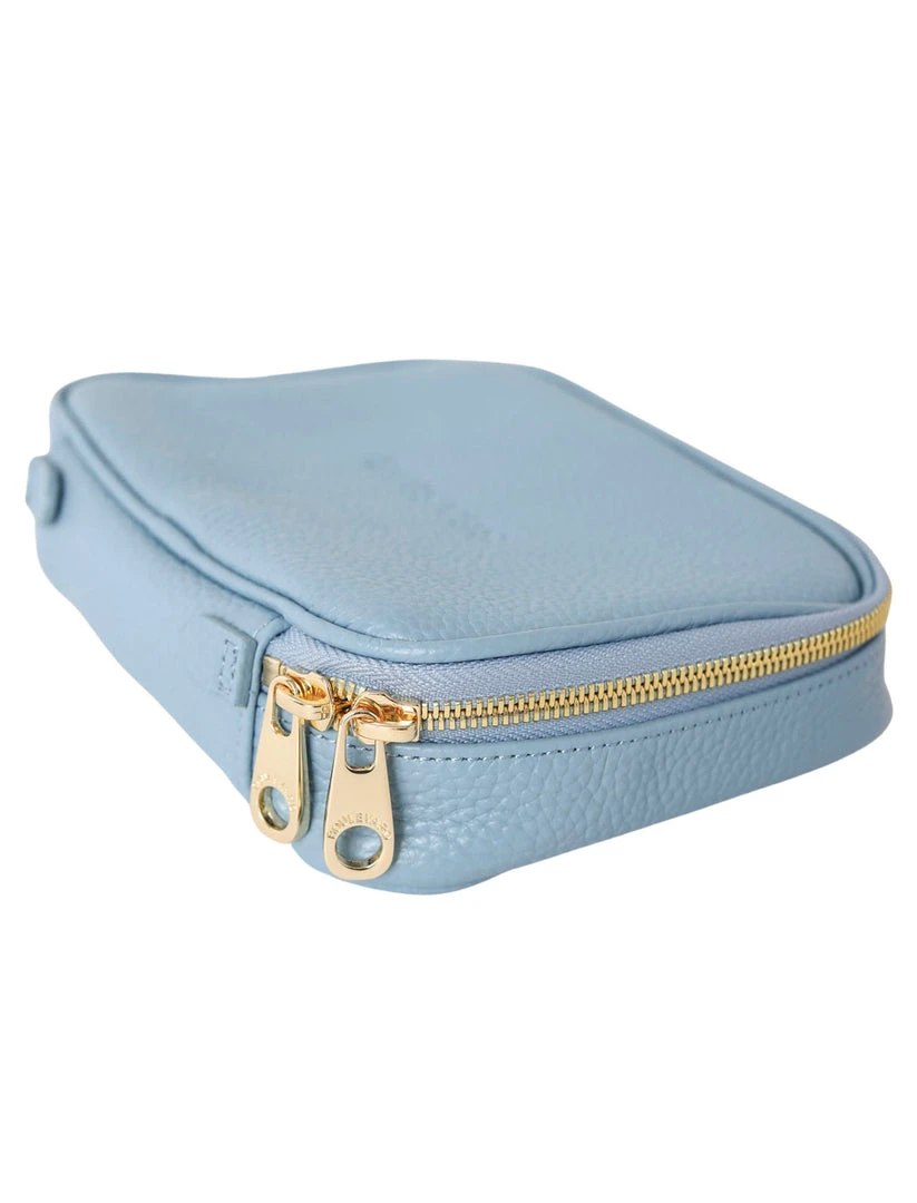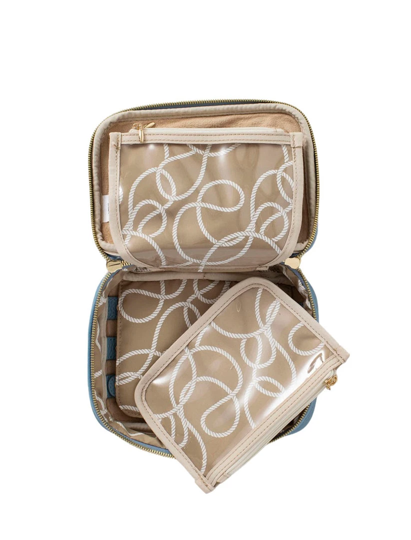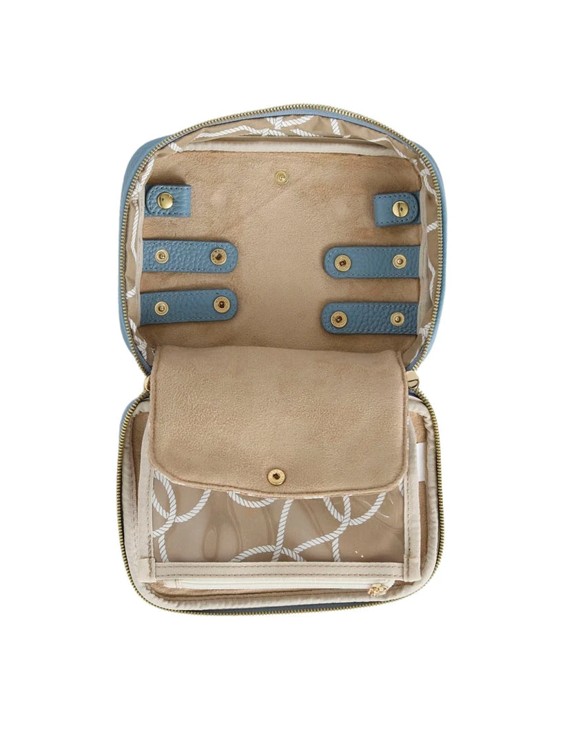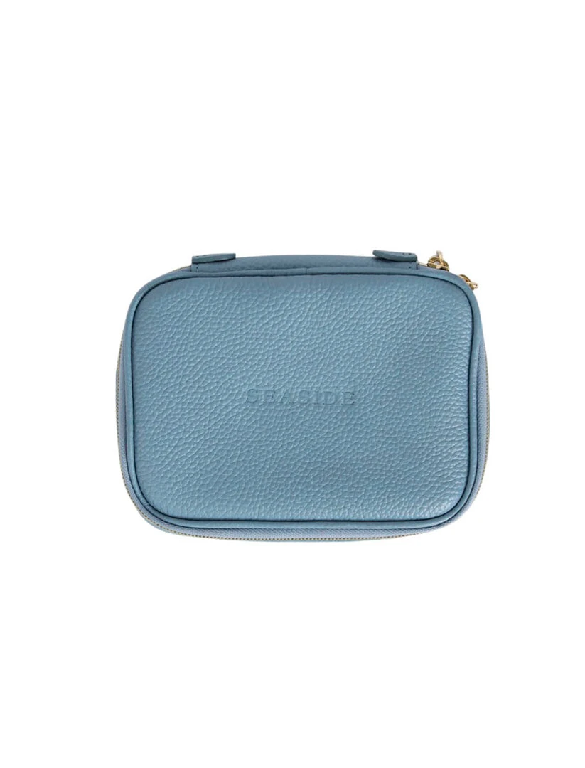 Sky Blue Seaside travel leather jewelry case. The lid features a ring strap. The main section features one removable and one attached storage pouch. The bottom section features a necklace organizer.