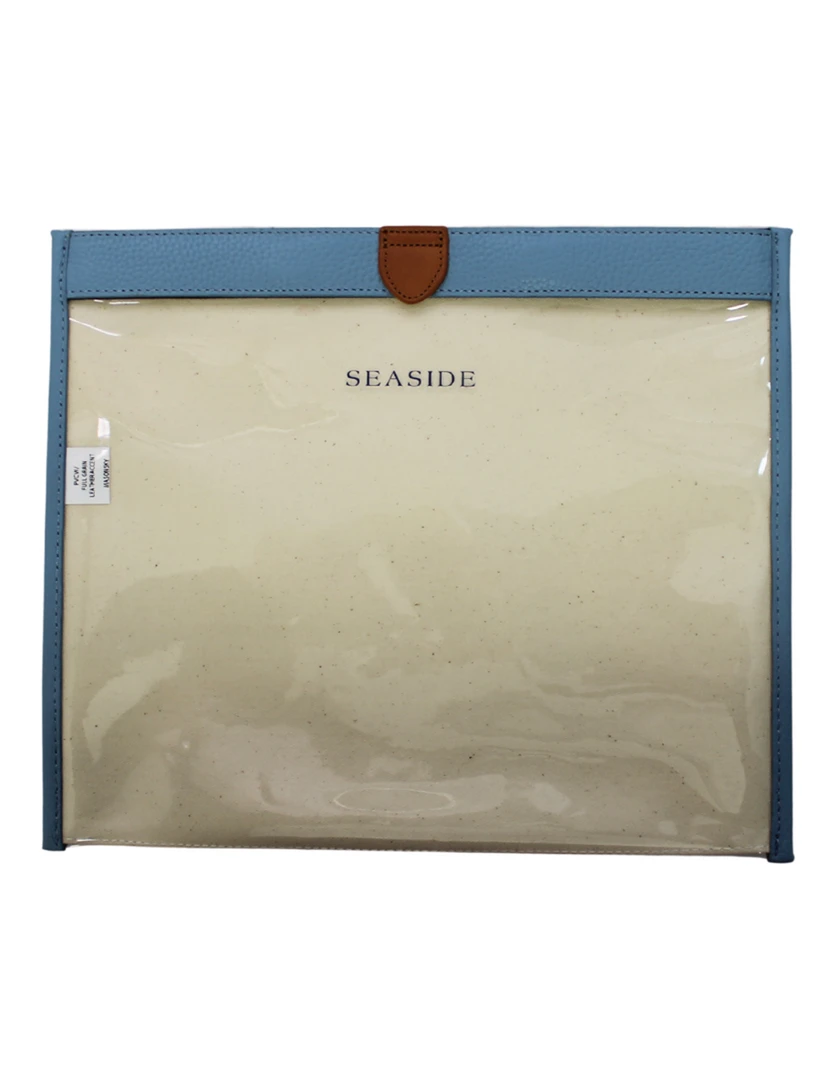 Clear Seaside document case with full grain leather backing. Magnetic top closure. This clear document case is made of Thermoplastic Polyurethane, it is solvent-free biodegradable material. The plastic will often grow foggy over time. Clean using rubbing alchohol.
