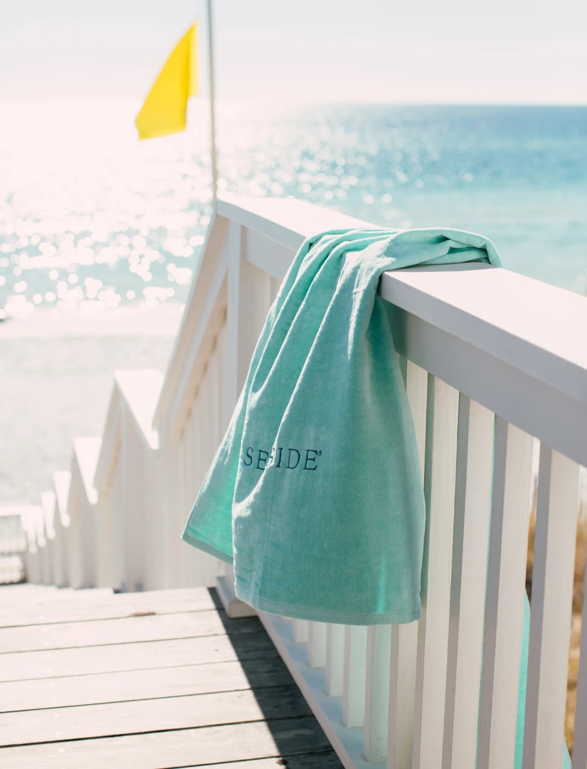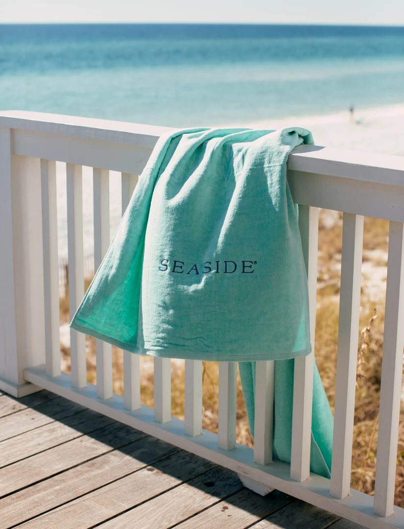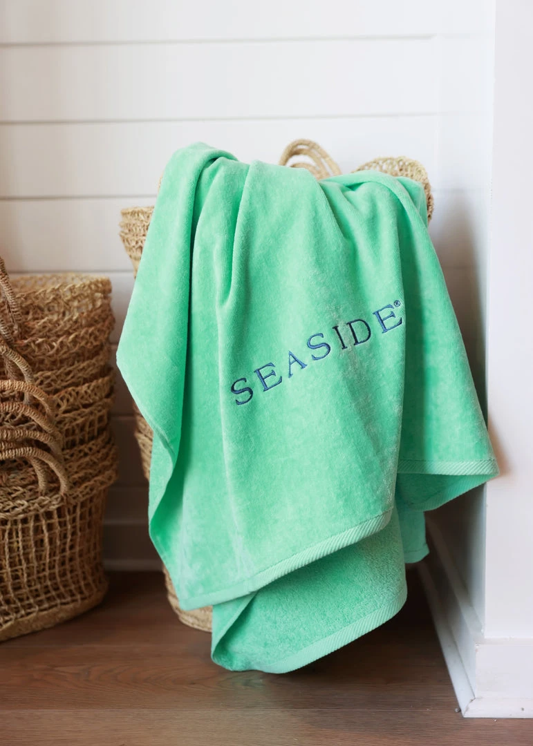 100% Cotton Velour towel with embroidered Seaside logo across the bottom.