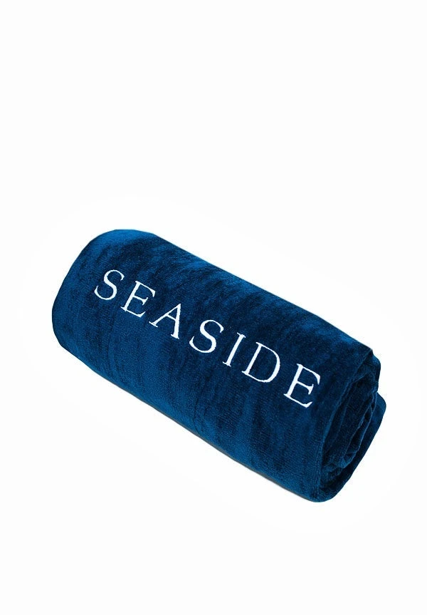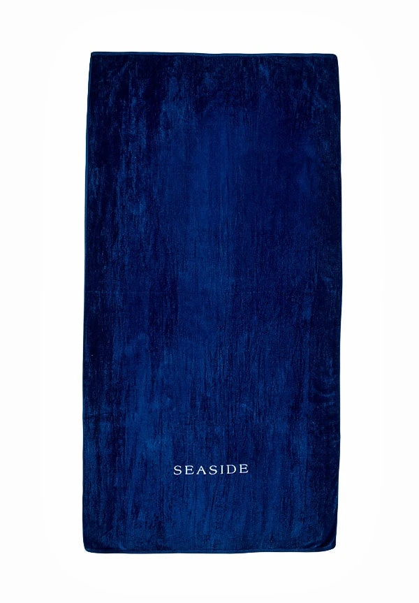 100% Cotton Velour towel in navy with embroidered Seaside logo in white across the bottom.