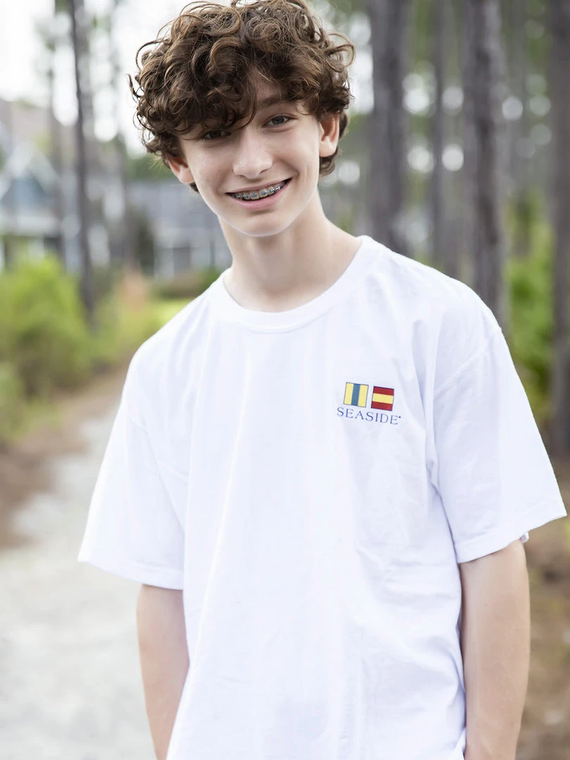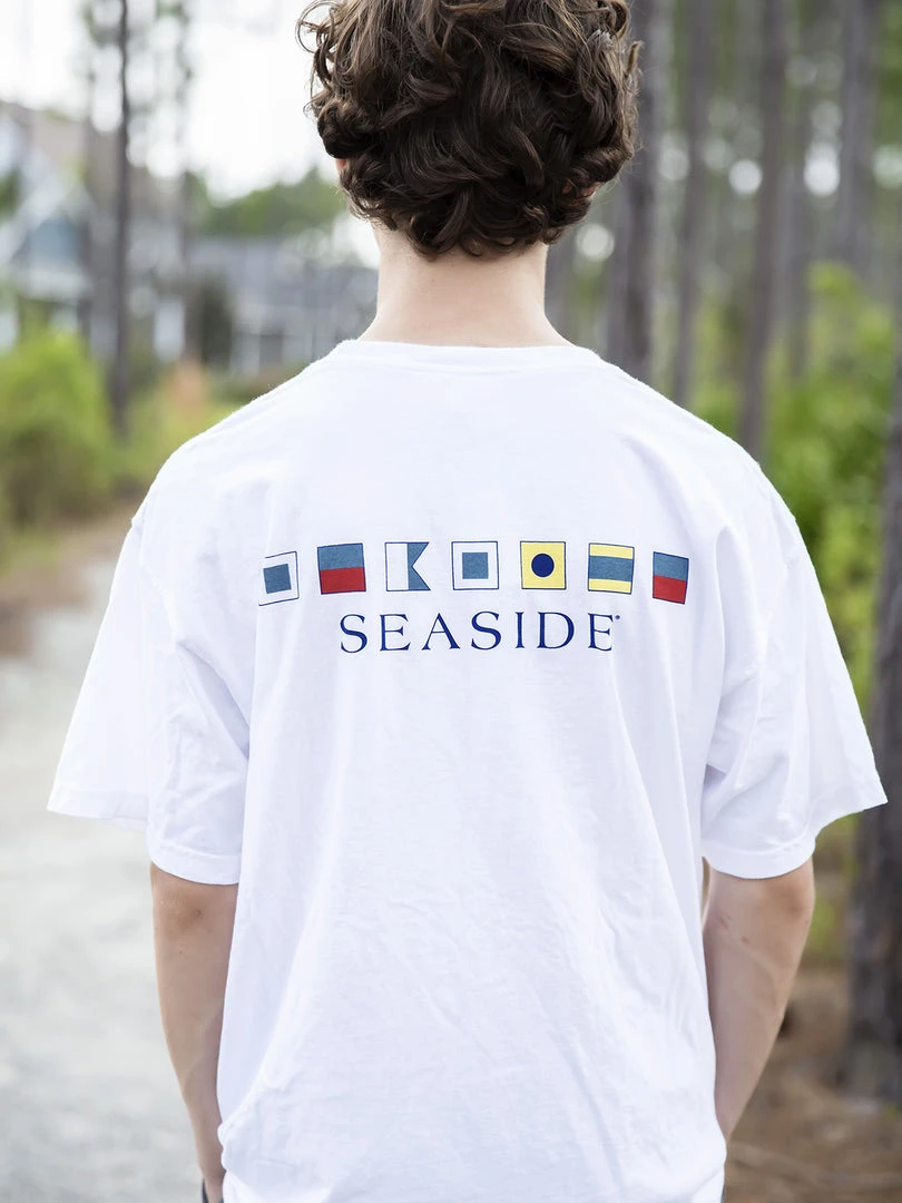 Inspired by vintage nautical flags, the flags on the back of the spell out SEASIDE using the maritime alphabet, and 1981 (the years of Seaside’s beginning) on the front.