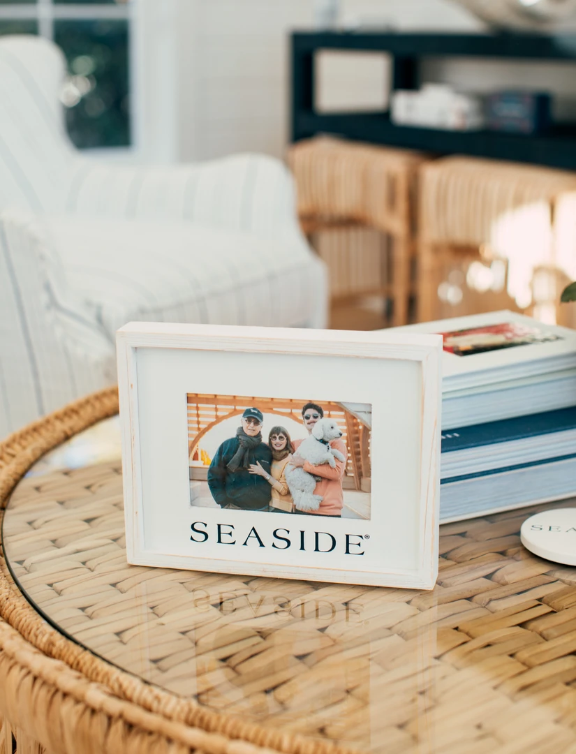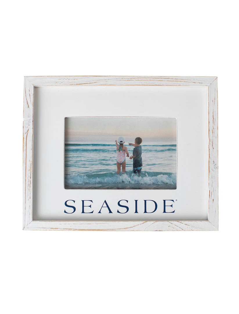 Wooden white-washed SEASIDE® picture frame holds 4″ x 6″ photo.