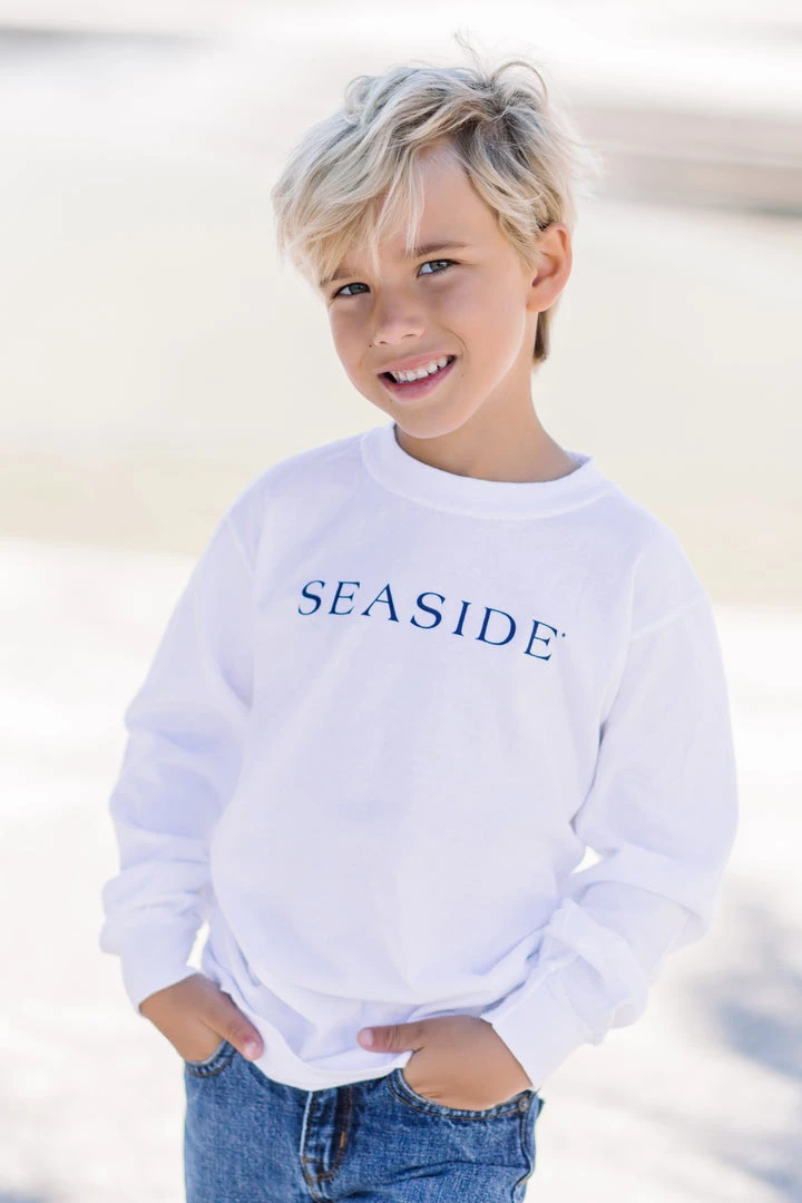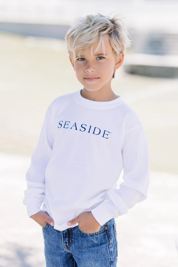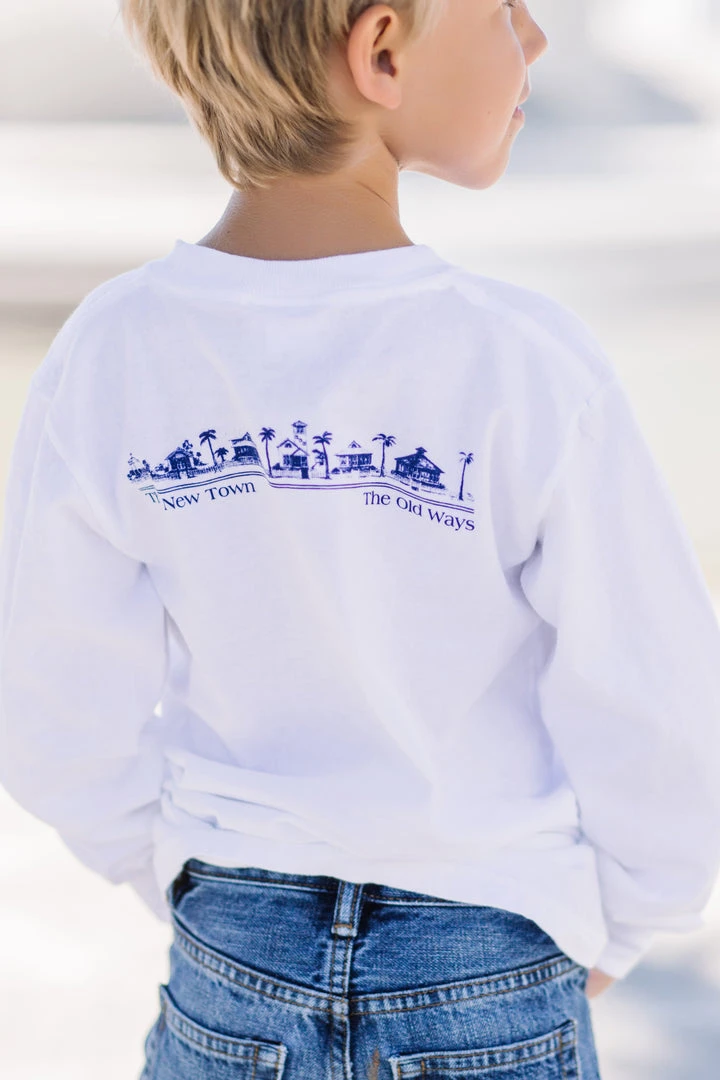 Long-sleeve 100% Preshrunk Cotton Tee. Seaside logo screen printed on the front. Classic “New Town…Old Ways” graphic on the back.