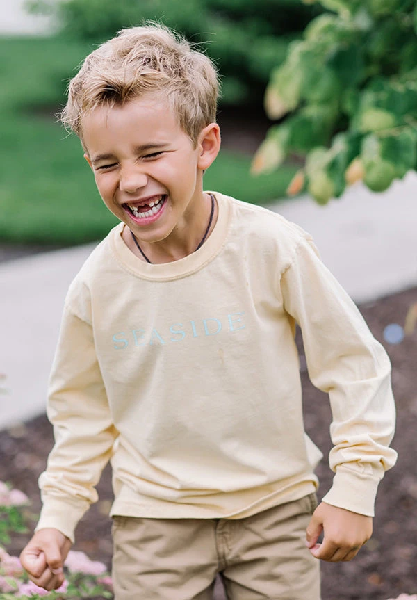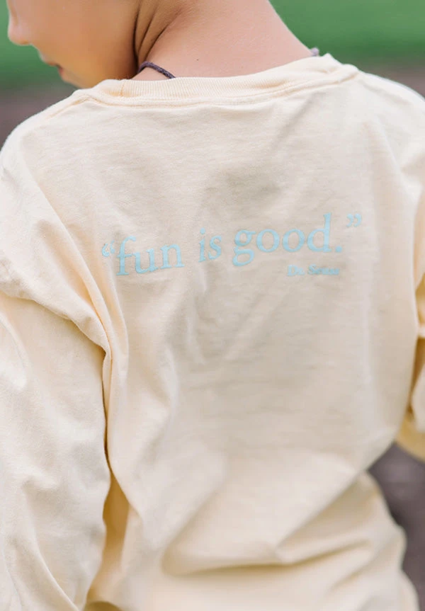 Long-Sleeve 100% Preshrunk Cotton Garment Dyed Tee. Seaside logo screen printed on the front. Tagline, “fun is good.” Dr. Seuss, on the back.